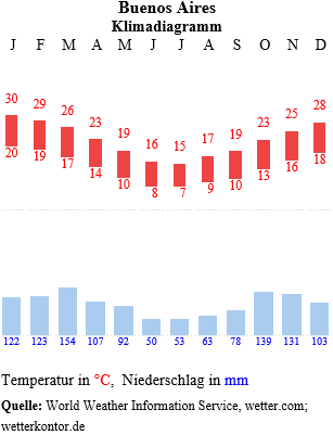 Buenos Aires befindet sich in der subtropischen Klimazone und hat nach Köppen ein feucht-subtropisches Klima (effektive Klimaklassifikation: Cfa). Die durchschnittliche Jahrestemperatur beträgt 17,73 Grad Celsius, die Jahresniederschlagsmenge 1214,6 Millimeter im Durchschnitt.